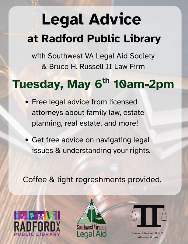The Radford Public Library is proud to offer this program in partnership with the Southwest Virginia Legal Aid Society and the Bruce H. Russell II Law Firm.