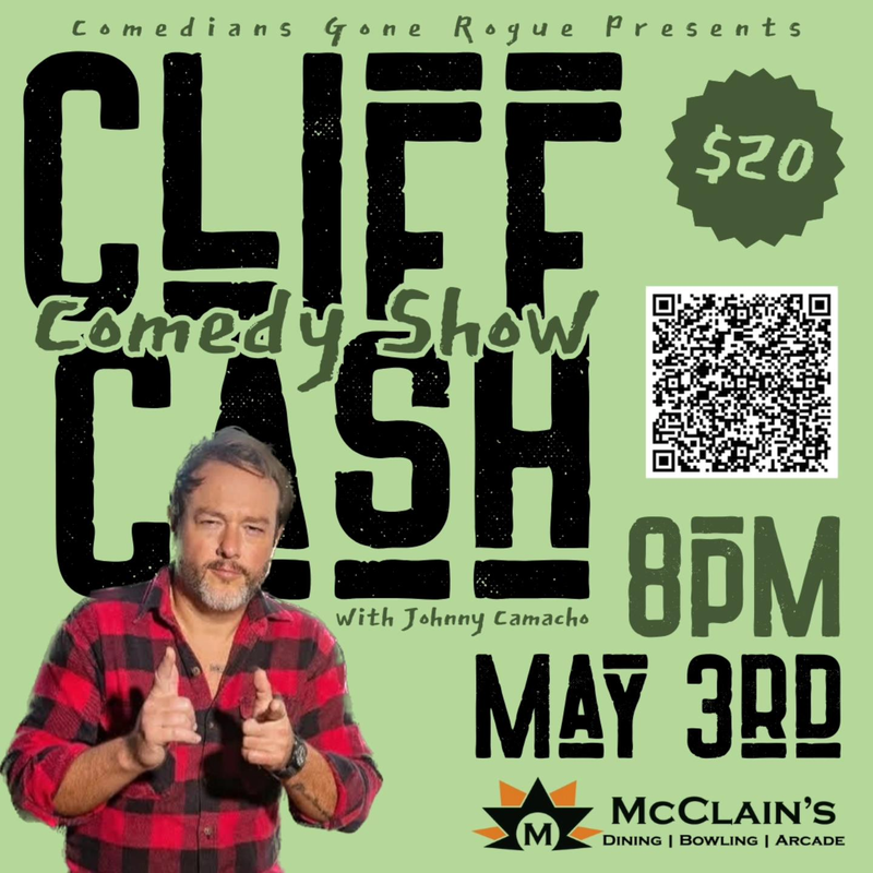 Comedians Gone Rogue and McClain's at First & Main presents a Comedy Show with headliner Cliff Cash on Saturday, May 3, 2025 at McClain's.