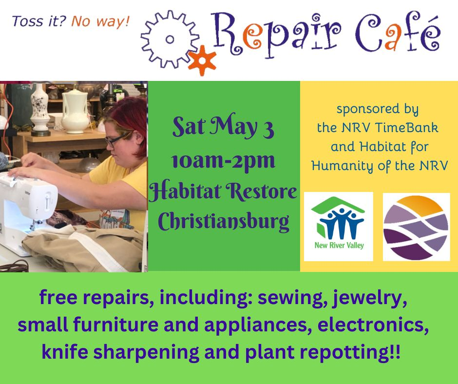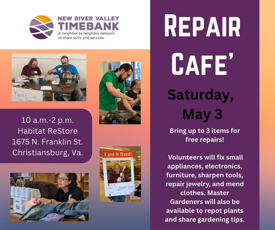 The New River Valley Timebank and the Habitat for Humanity ReStore presents the 2025 Spring Repair Cafe on Saturday, May 3, 2025.
