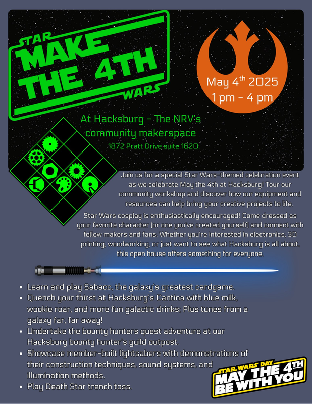 Join us for a special Star Wars-themed open house as we celebrate May the 4th at Hacksburg! Tour our community workshop and discover how our equipment and resources can help bring your creative projects to life. Throughout the day, we'll showcase member-built lightsabers with demonstrations of their construction techniques, sound systems and illumination methods.