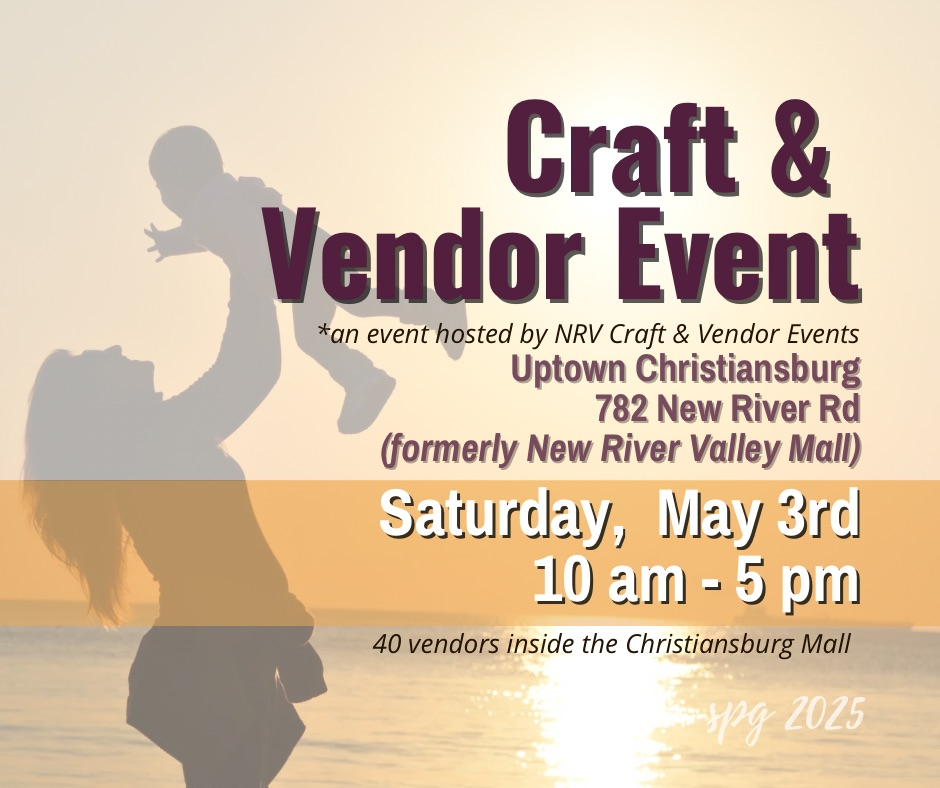 NRV Craft & Vendor Events hosts their 2025 May Craft & Vendor Fair on Saturday, May 3, 2025 at Uptown Christiansburg (formerly New River Valley Mall).
