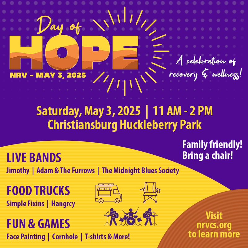 New River Valley Community Services (NRVCS) presents Day Of Hope NRV: A Celebration of Recovery & Wellness on Saturday, May 3, 2025 at Christiansburg Huckleberry Park.