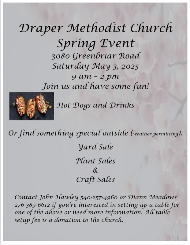 Draper Methodist Church presents their Spring Event with Yard Sales, Plant Sales & Craft Sales on Saturday, May 3, 2025.