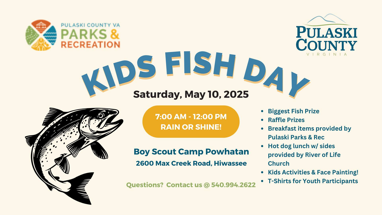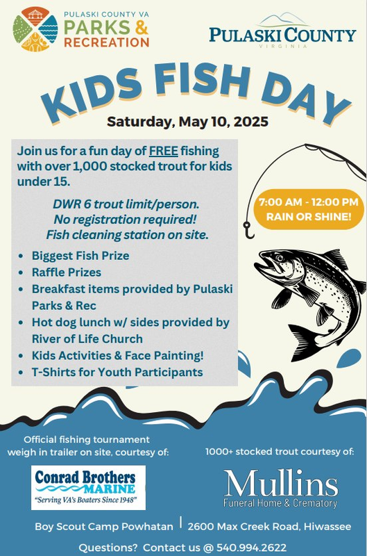 The 2025 Pulaski County Kids Fishing Day will be held at Camp Powhatan located in Pulaski County on Saturday, May 10, 2025.