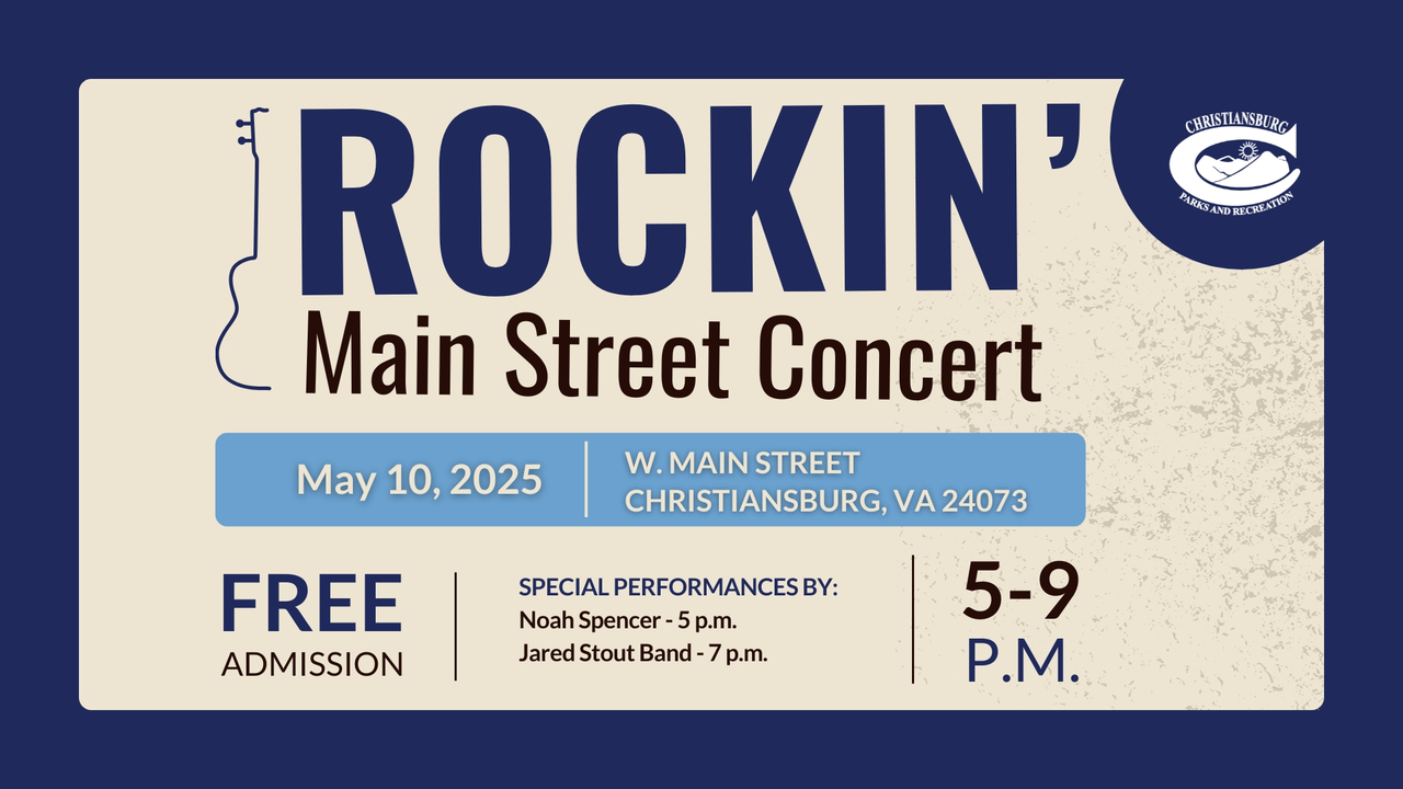 The Town of Christiansburg and the Christiansburg Parks & Rec kicks off their 2025 Rockin' Main Street Concert Series featuring music from The Jared Stout Band and Noah Spencer on Saturday, May 10, 2025 in downtown Christiansburg, VA at the intersection of West Main Street and Hickok Street.