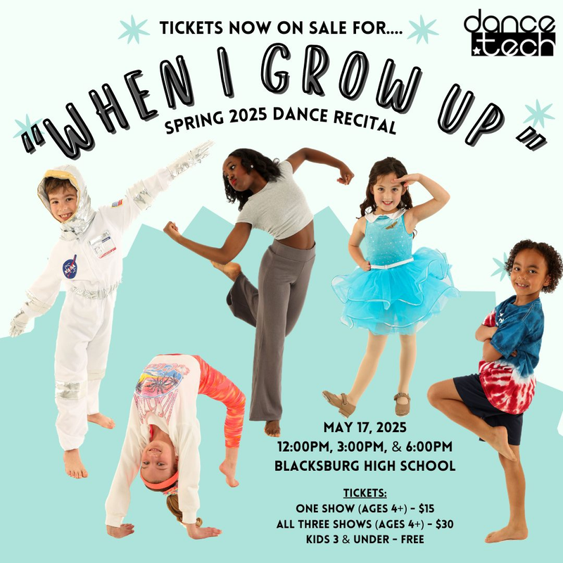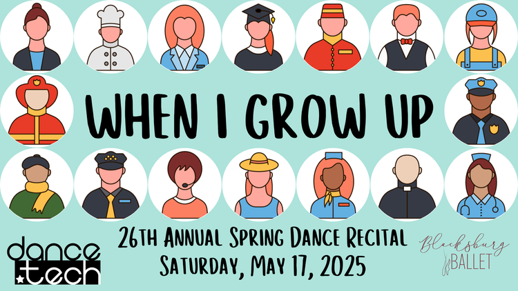 Dance.tech presents their 26th Annual Spring Dance Recital titled "When I Grow Up" with three performances on Saturday, May 17, 2025 at Blacksburg High School Auditorium.