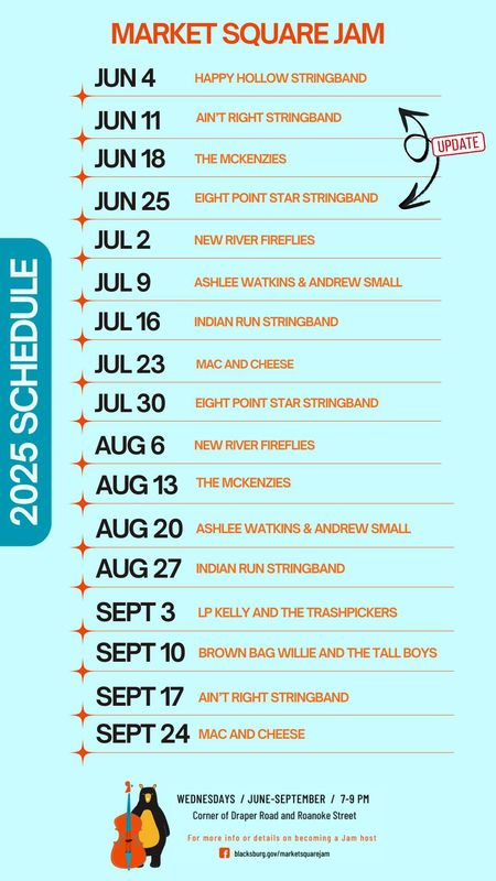 The Town of Blacksburg continues the 2025 Market Square Jam with host band Ashlee Watkins and Andrew Small on Wednesday, July 9, 2025 at Market Square Park in downtown Blacksburg, VA.