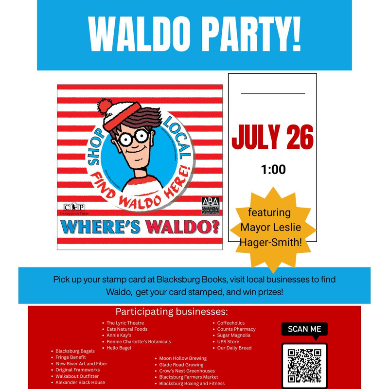 Blacksburg Books presents the 2025 Waldo Party on Saturday, July 26, 2025.