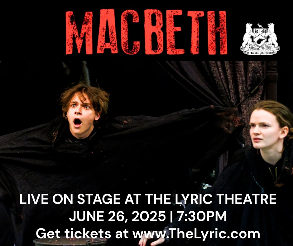 The Lyric Theatre presents a live performance of William Shakespeare's "Macbeth" performed by The Rustic Mechanicals on Thursday, June 26, 2025.