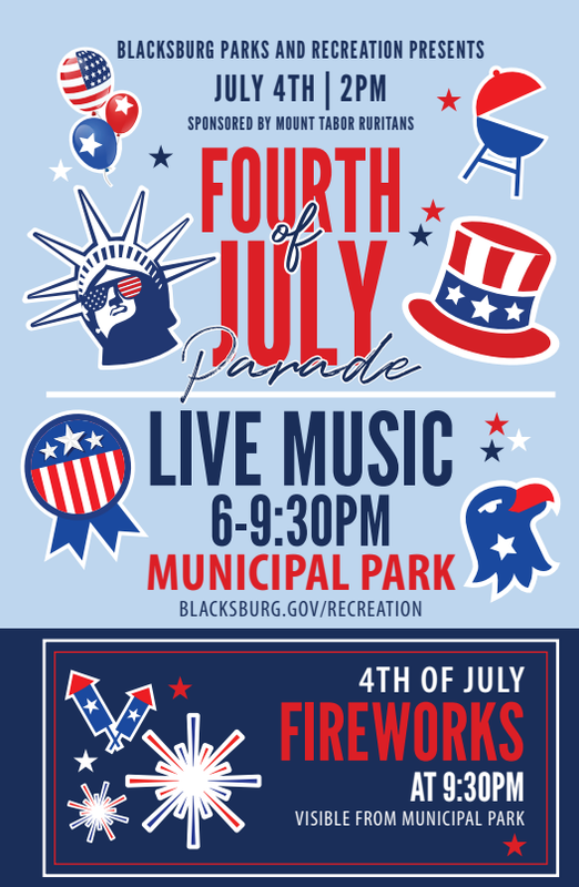 Beginning at 6:00 PM, the Blacksburg Parks & Rec Department will have music, food and entertainment at the Blacksburg Municipal Park ending with fireworks starting around 9:30 PM. For the event listing, visit: