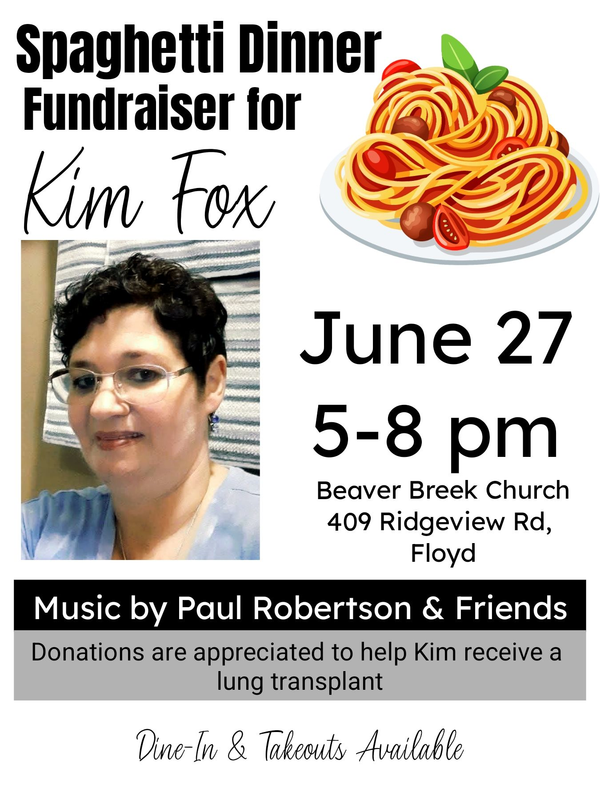 Enjoy a spaghetti dinner to help local Floyd County resident Kim Fox to help with her expenses for an upcoming lung transplant. Both dine-in and takeout dinners will be available.