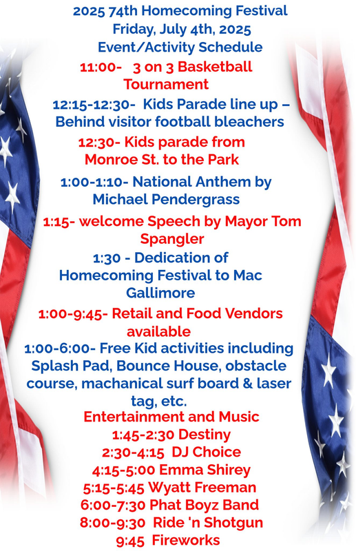The Town of Narrows and the Narrows Parks & Recreation presents the 74th Annual Narrows Homecoming Festival and July 4th Celebration on Friday, July 4, 2025 at the Narrows Town Park.