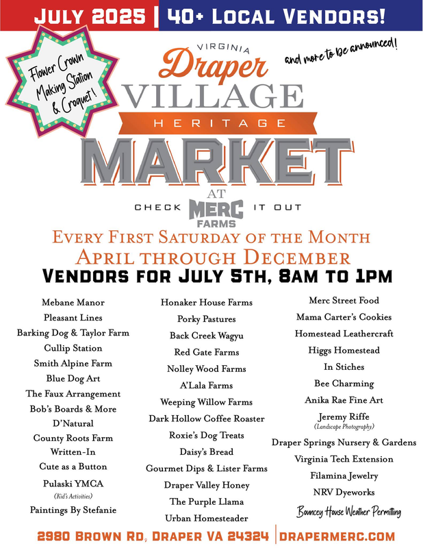 Located in the heart of Draper, VA, the Draper Village Heritage Market is a vibrant gathering place that celebrates our community’s rich heritage, craftsmanship, and agricultural roots. Experience the best of local arts, crafts, and food while enjoying workshops, hands-on demonstrations, and interactive exhibits that honor traditions and promote sustainable living. Join us to grow roots, get grounded, and embrace the spirit of community and culture that defines Draper Village. The Heritage Market will be held on the first Saturday of the month from April through December.