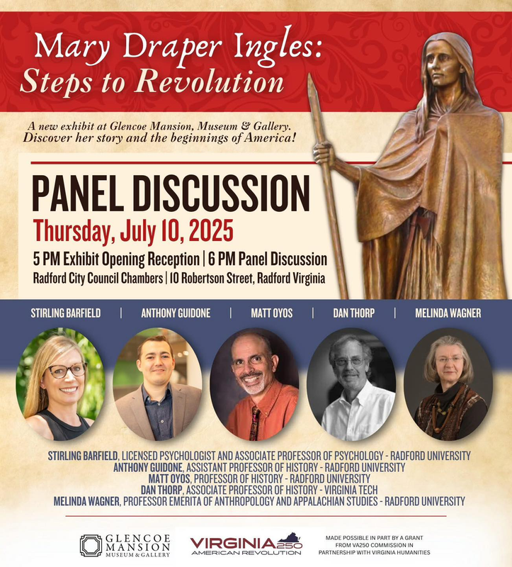 Glencoe Mansion, Museum & Gallery presents the opening reception for its new exhibit "Mary Draper Ingles: Step to Revolution" followed by a panel discussion on Thursday, July 10, 2025 at the Radford City Council Chambers located within the the Radford City Public Safety Building.