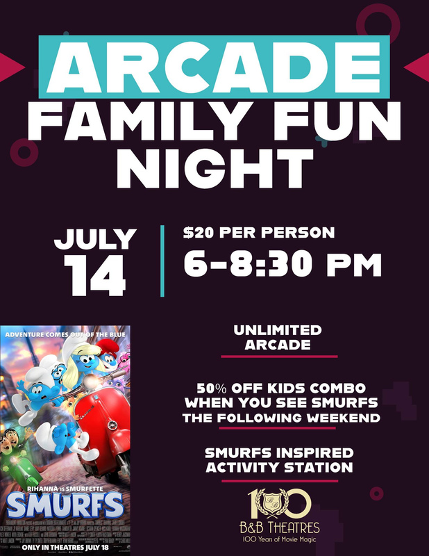 For just $20.00 per person, enjoy two hours of unlimited arcade play, 1,000 redemption points, Smurfs-inspired activity station, boards games available all evening and 50% off a Kids Combo when you come back to see the new Smurfs film the following weekend!