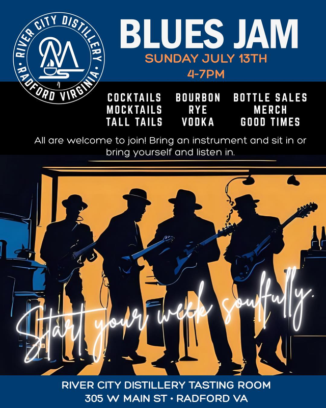 Blues Jam Venue:River City Distillery, Radford Directions:Google Map Link Date: Sunday, July 13, 2025 Time: 4:00 - 7:00 PM Event Types: Music Cost: Free