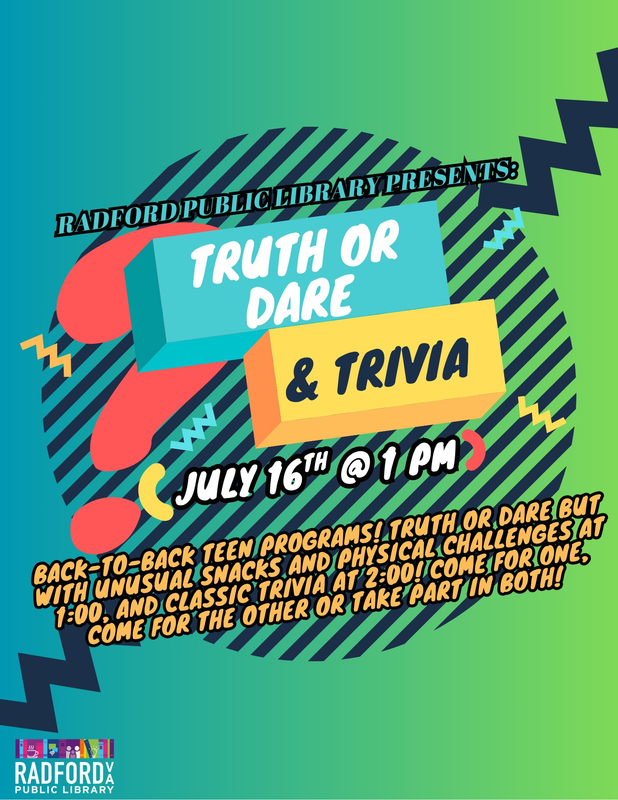 The Radford Public Library presents a Teen Double Feature with Truth or Dare and Trivia on Wednesday, July 16, 2025.