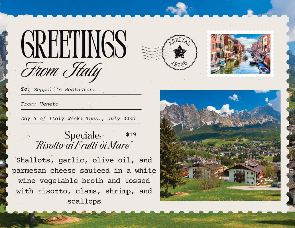 Zeppoli's presents their 6th Annual Italy Week starting on Sunday, July 20, 2025 and continuing through Wednesday, July 23, 2025. For the third day of Italy Week, enjoy Risotto ai Frutti di Mare on Tuesday, July 22, 2025.