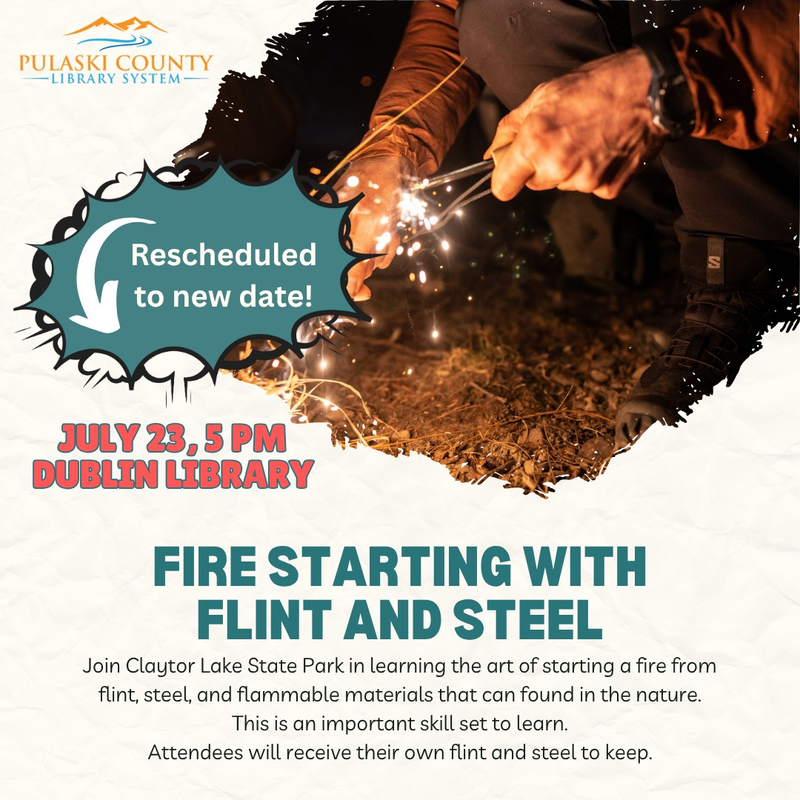The Charles & Ona B Free Memorial Library (Dublin Library) presents the class "Fire Starting with Flint and Steel" on Wednesday, July 23, 2025.