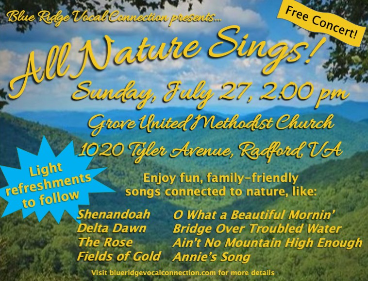 Blue Ridge Vocal Connection presents their free concert titled "All Nature Sings" on Sunday, July 27, 2025 at Grove United Methodist Church in Radford, VA.