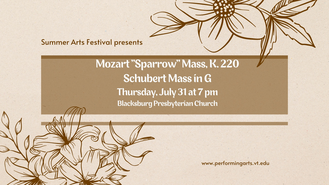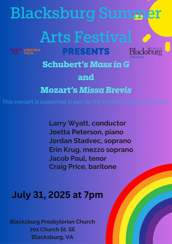The Virginia Tech School of Performing Arts and the Blacksburg Master Chorale, in conjunction with the Town of Blacksburg Summer Arts Festival will present a concert of Schubert Mass in G and Mozart Sparrow Mass at 7:00 PM at Blacksburg Presbyterian Church.