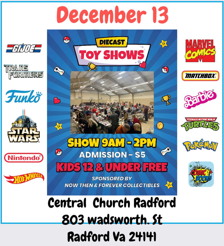 Now, Then & Forever Collectibles presents their December NRV Diecast & Toy Show and final show of 2025 on Saturday, December 13, 2025 at Central Church in Radford, VA.