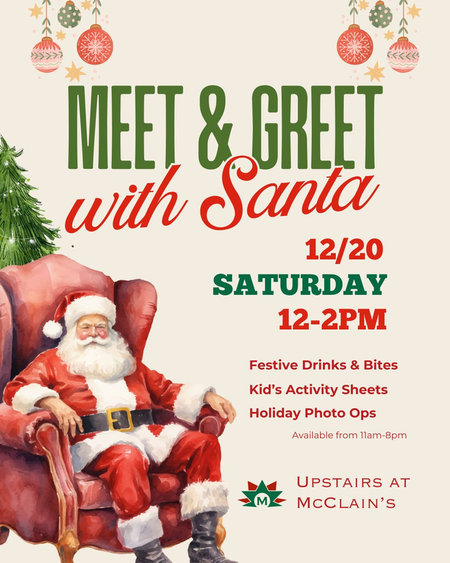 Step into the holiday season at McClain’s as we launch our Christmas Pop-Up Bar! Festive food and drinks will be available only on Santa Meet & Greet Saturdays (December 6th, 13th & 20th), when the full holiday experience comes to life with themed cocktails, food, and cheer.