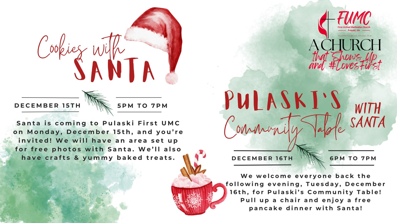 First United Methodist Church of Pulaski presents Cookies & Photos with Santa on Monday, December 15, 2025.