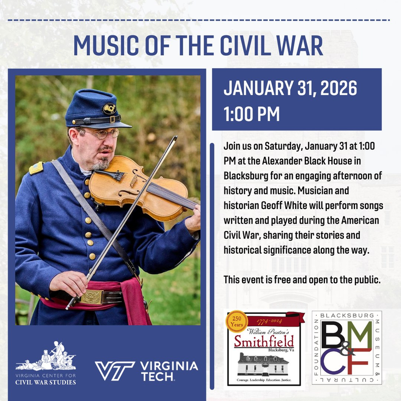The Blacksburg Museum and Cultural Foundation presents Music of the Civil War on Saturday, January 31, 2026 at the Alexander Black House & Cultural Center.