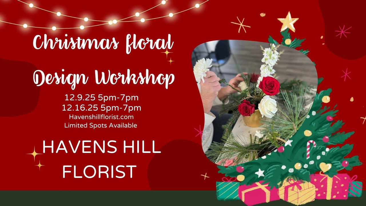 Havens Hill Florist presents a Christmas Floral Design Workshop on Tuesday, December 16, 2025.