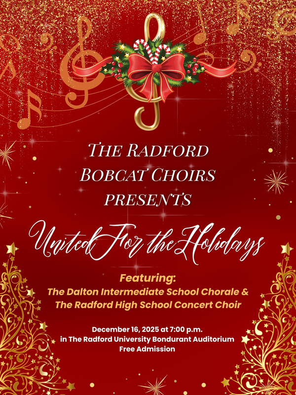 The Radford Bobcat Choirs presents their holiday concert titled "United for the Holidays" on Tuesday, December 16, 2025 inside the Bondurant Auditorium located within Preston Hall on the campus of Radford University.