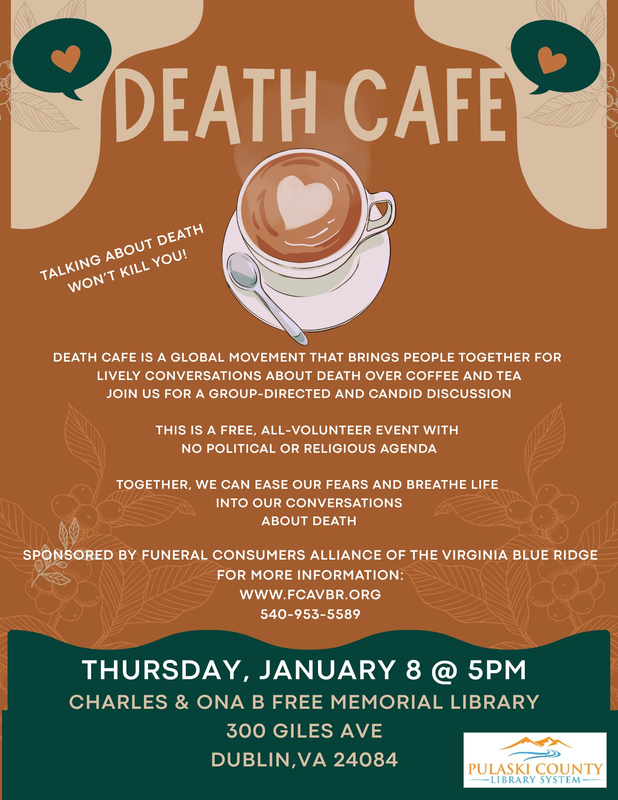 The Charles & Ona B Free Memorial Library (Dublin Library) presents the Death Cafe on Thursday, January 8, 2026.