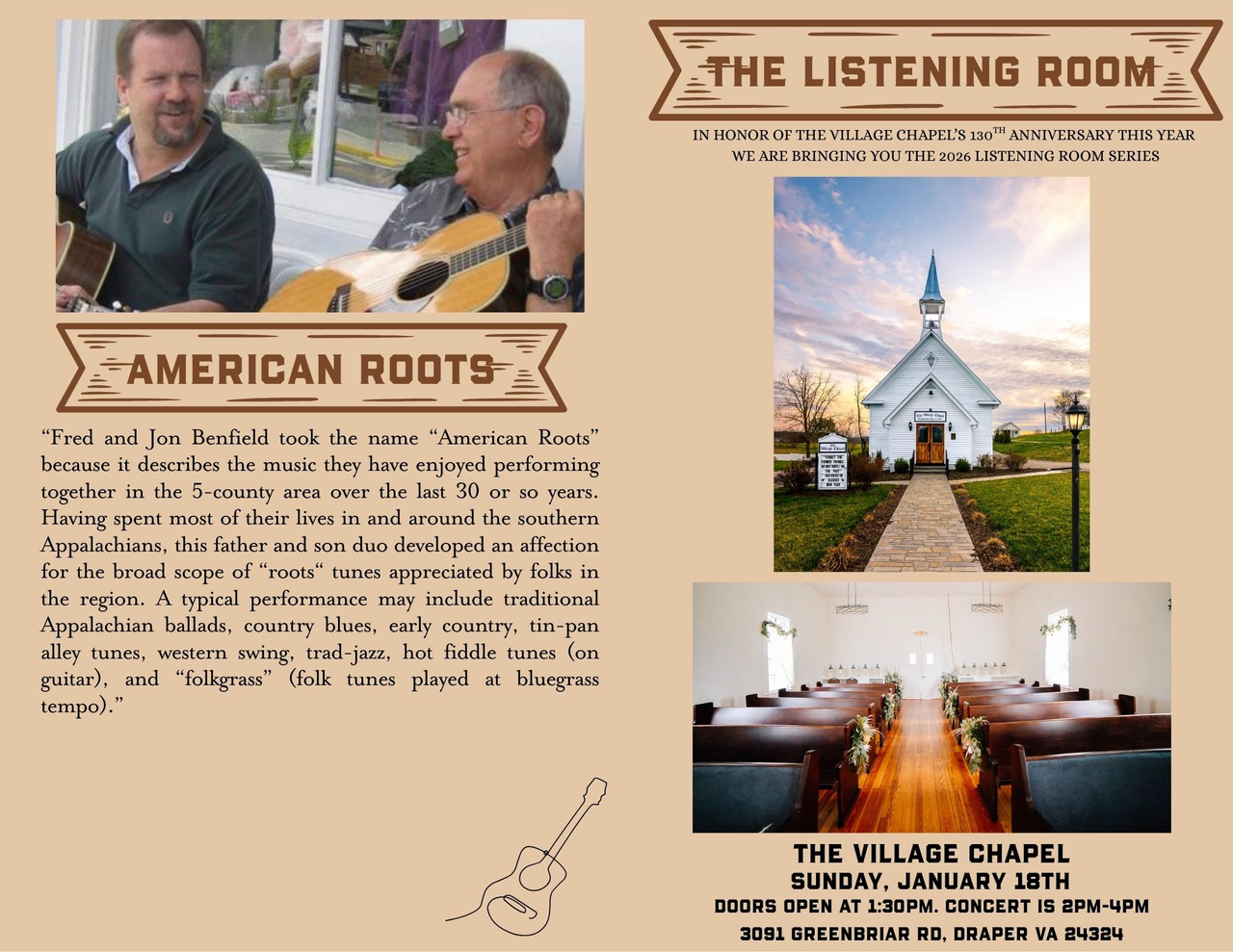 Thee Draper Village presents The Winter Listening Room January Concert featuring American Roots on Sunday, January 18, 2026 in The Village Chapel.