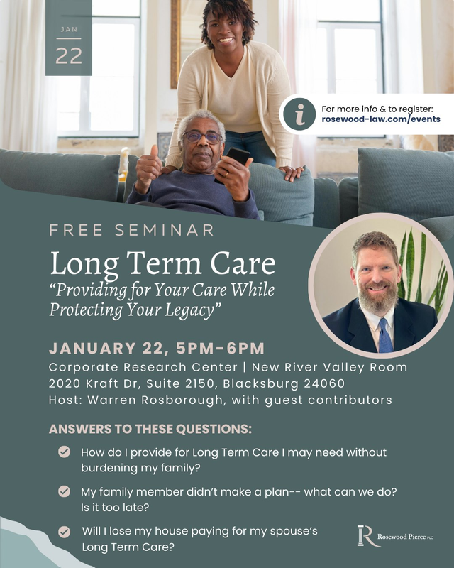 Warren Rosborough of Rosewood Pierce PLC presents a Free Seminar titled "Providing for Your Care while Protecting Your Legacy" on Thursday, January 22, 2026 in the New River Valley Room within the Corporate Research Center Training and Events Center in Blacksburg, VA.
