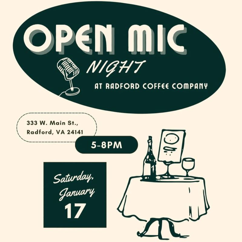 Radford Coffee Company presents their January Open Mic Night on Saturday, January 17, 2026.