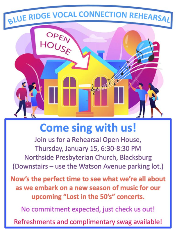 Blue Ridge Vocal Connection presents their Rehearsal Open House on Saturday, January 15, 2026 at Northside Presbyterian Church in Blacksburg, VA.