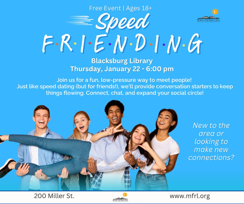 The Blacksburg Library presents Speed Friending for ages 18 and above on Thursday, January 22, 2026.