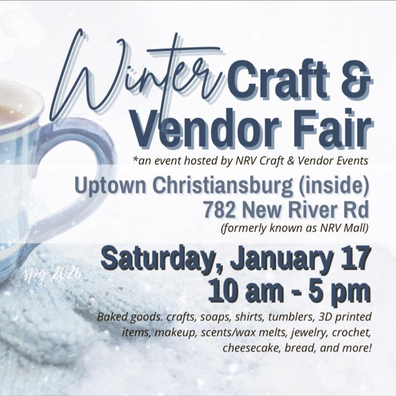 NRV Craft & Vendor Events hosts their Winter Craft & Vendor Fair on Saturday, January 17, 2026 at Uptown Christiansburg (formerly New River Valley Mall).