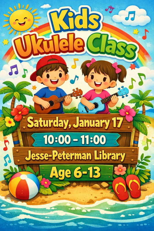 The Jessie Peterman Library presents the program "Ukes for Kids" on Saturday, January 17, 2026.