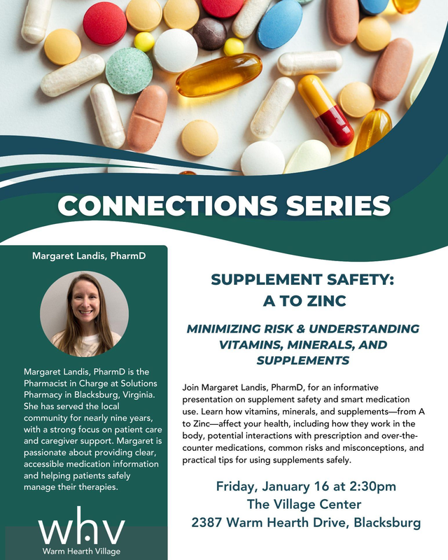 Warm Hearth Village continues their Connections Series with an event tilted "Supplement Safety: A To Zinc" on Friday, January 16, 2026 at Warm Hearth Village Center in Blacksburg, VA.