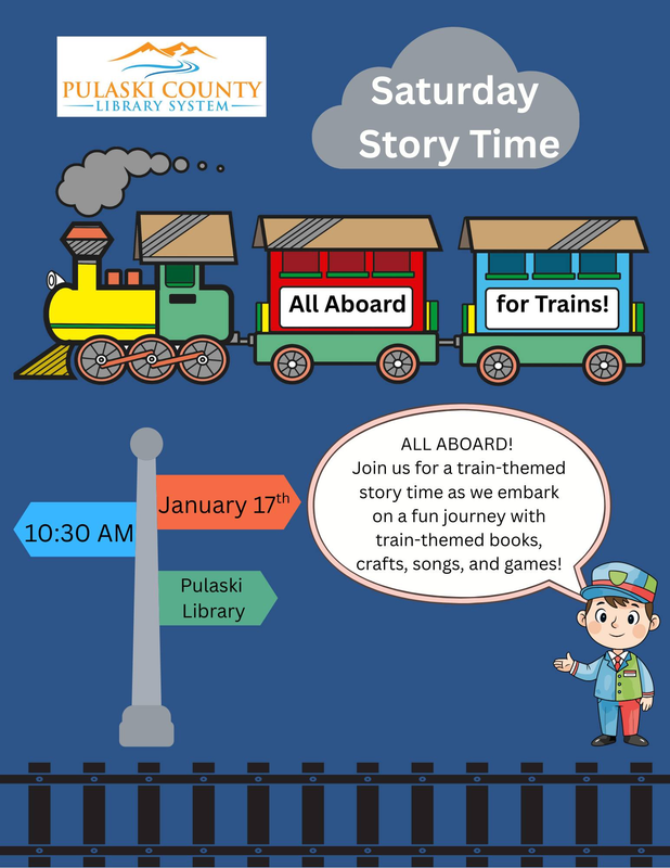 The Pulaski County Library presents a Saturday Story Time titled "All Aboard for Trains" on Saturday, January 17, 2026.