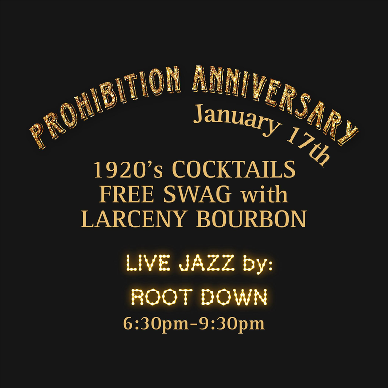 Celebrate the anniversary of the start of Prohibition which went into effect on January 17, 1920. Enjoy 1920s cocktails, free swag with Larceny Bourbon and live jazz music from Root Down from 6:30-9:30 PM.