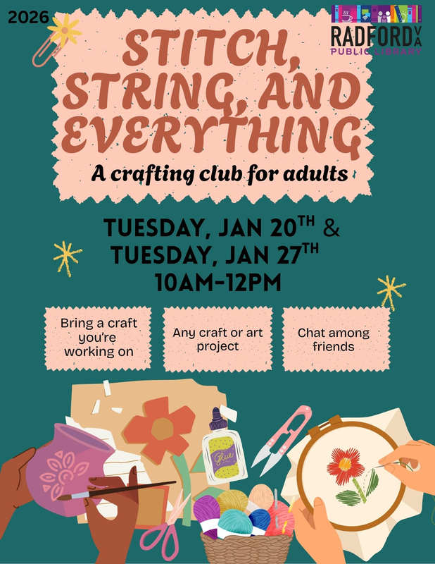 The Radford Public Library presents Stitch, String & Everything: A Crafting Club for Adults on Tuesday, January 20, 2026.