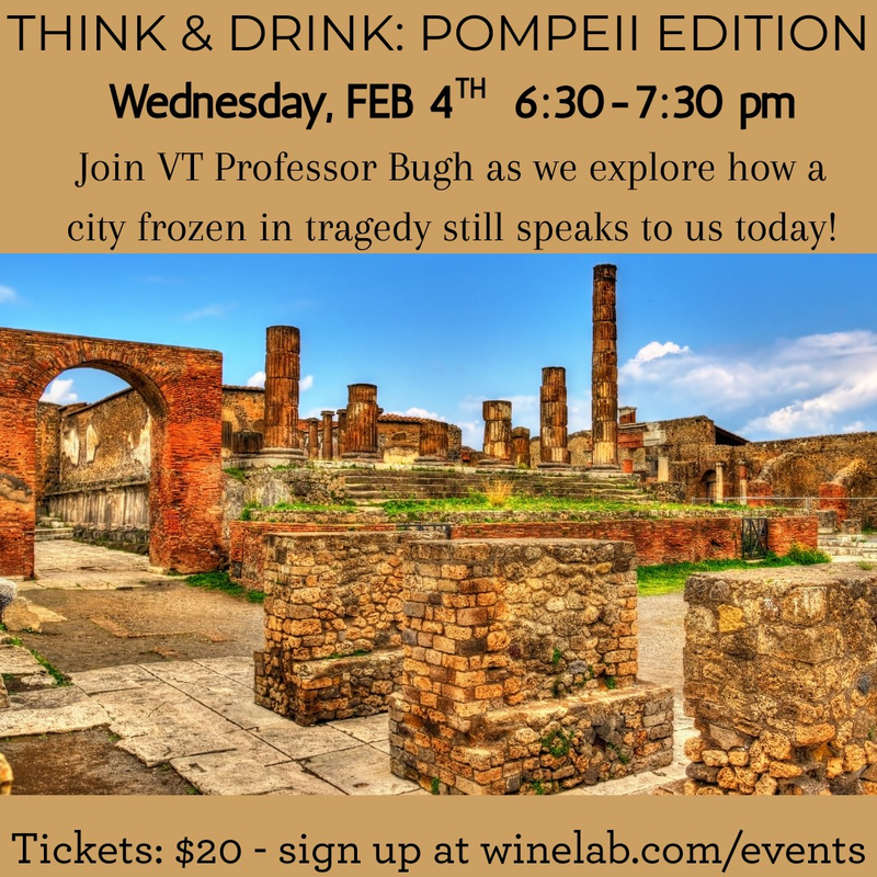 Blacksburg Wine Lab continues their Think and Drink series with an event titled "Pompeii: Death and the Afterlife of a Roman Town" on Wednesday, February 4, 2026.