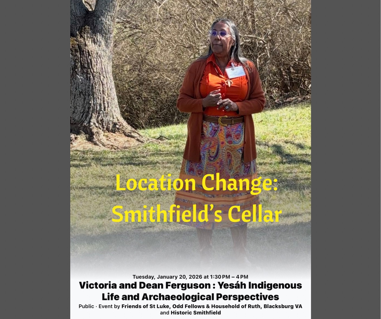 Historic Smithfield hosts Victoria and Dean Ferguson presenting "Yesah Indigenous Life and Archaeological Perspectives" on Tuesday, January 20, 2026 in The Cellar at Historic Smithfield.