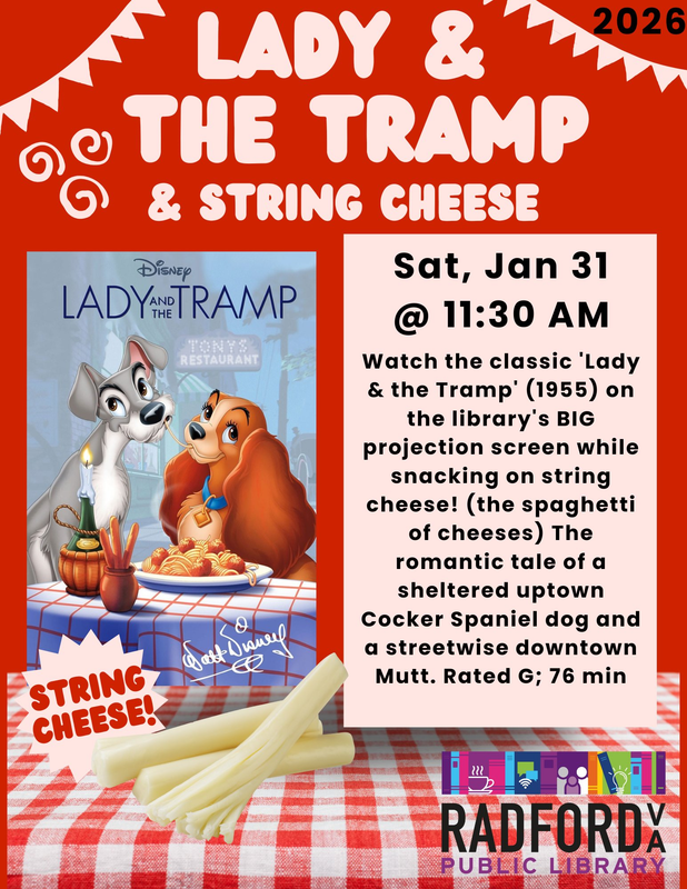The Radford Public Library presents a screening of "Lady & The Tramp" with string cheese on Saturday, January 31, 2026.
