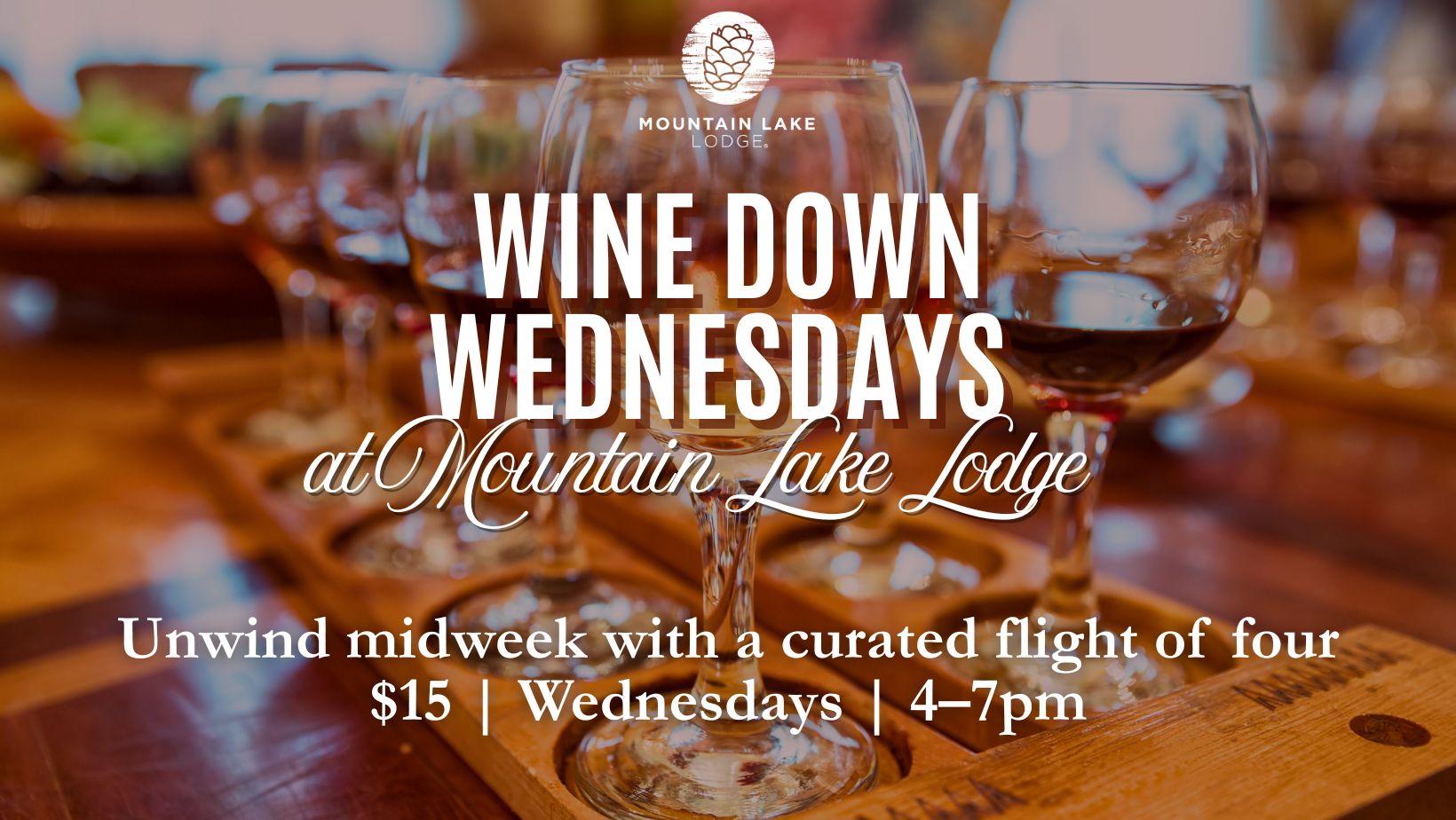 Mountain Lake Lodge presents Wine Down Wednesdays every Wednesday from 4:00-7:00 PM through Wednesday, March 25, 2026.