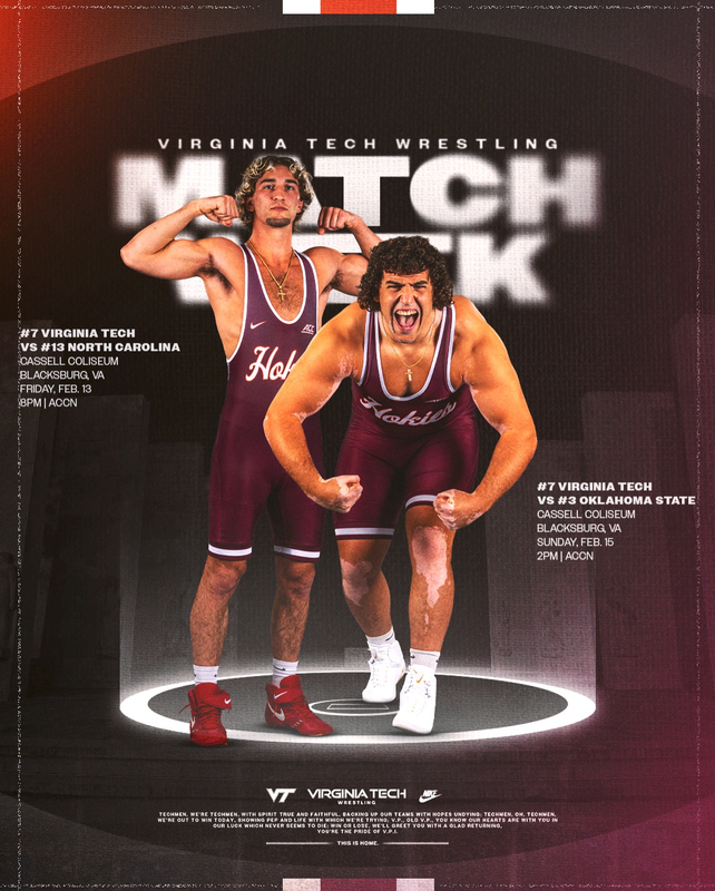 The #7 ranked Virginia Tech Wrestling team continues their 2025/2026 home schedule against #3 ranked non-conference opponent Oklahoma State on Sunday, February 15, 2026 inside Cassell Coliseum on the campus of Virginia Tech.