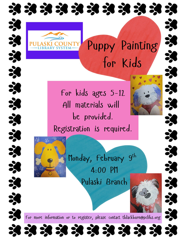 The Pulaski County Library presents Puppy Painting for Kids on Monday, February 9, 2026.