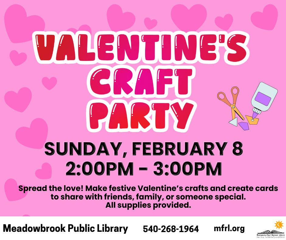 The Meadowbrook Public Library presents Valentine's Craft Party on Sunday, February 8, 2026.